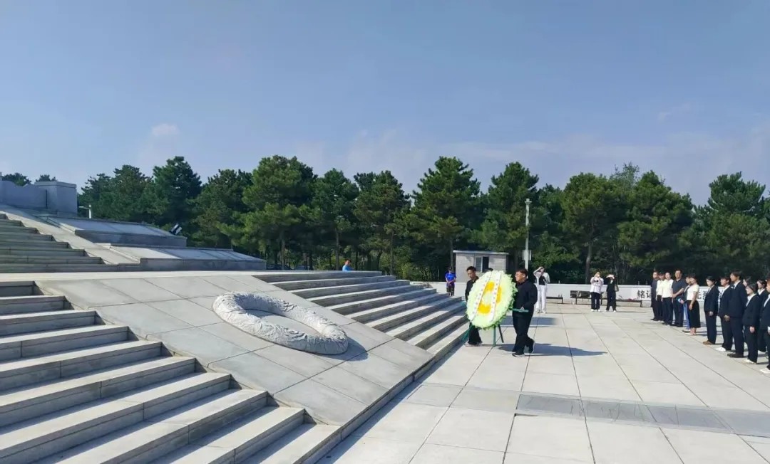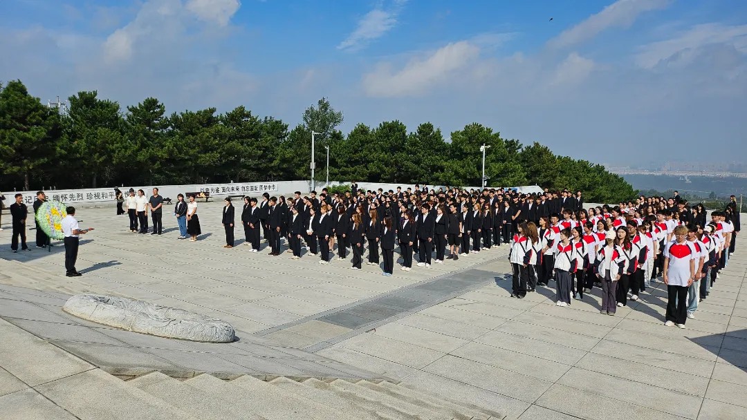 在阜新万人坑死难矿工纪念碑前,全体师生整齐列队。现场氛围庄严肃穆,师生怀着崇敬与缅怀之情,向在抗日战争中遇难的同胞默哀。学生代表敬献花圈,寄托无限哀思。